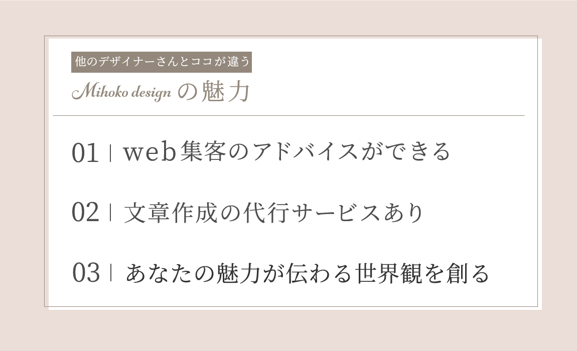 はじめにお読みください。「世界観が大切」ということは分かるけれど、「自分で世界観を表現するの難しい」という方のためのホームページ制作所です。最近は『綺麗+見やすい』ホームページがお客さまに好まれるようになっています。あなたの魅力を伝える世界観を一緒に創っていきませんか?